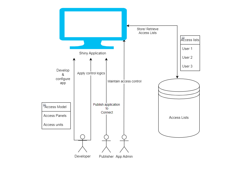App admin controls and maintains access lists within the app. A nice shiny GUI is provided to facilitate this.